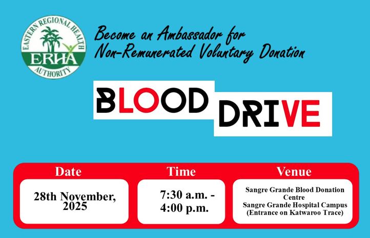 The Eastern Regional Health Authority invites you to become an Ambassador for Non-Remunerated Voluntary Donation. Friday 28th November, 20257:30 a.m. – 4:00 p.m.Sangre Grande Blood Donation CentreSee flyer for additional details.