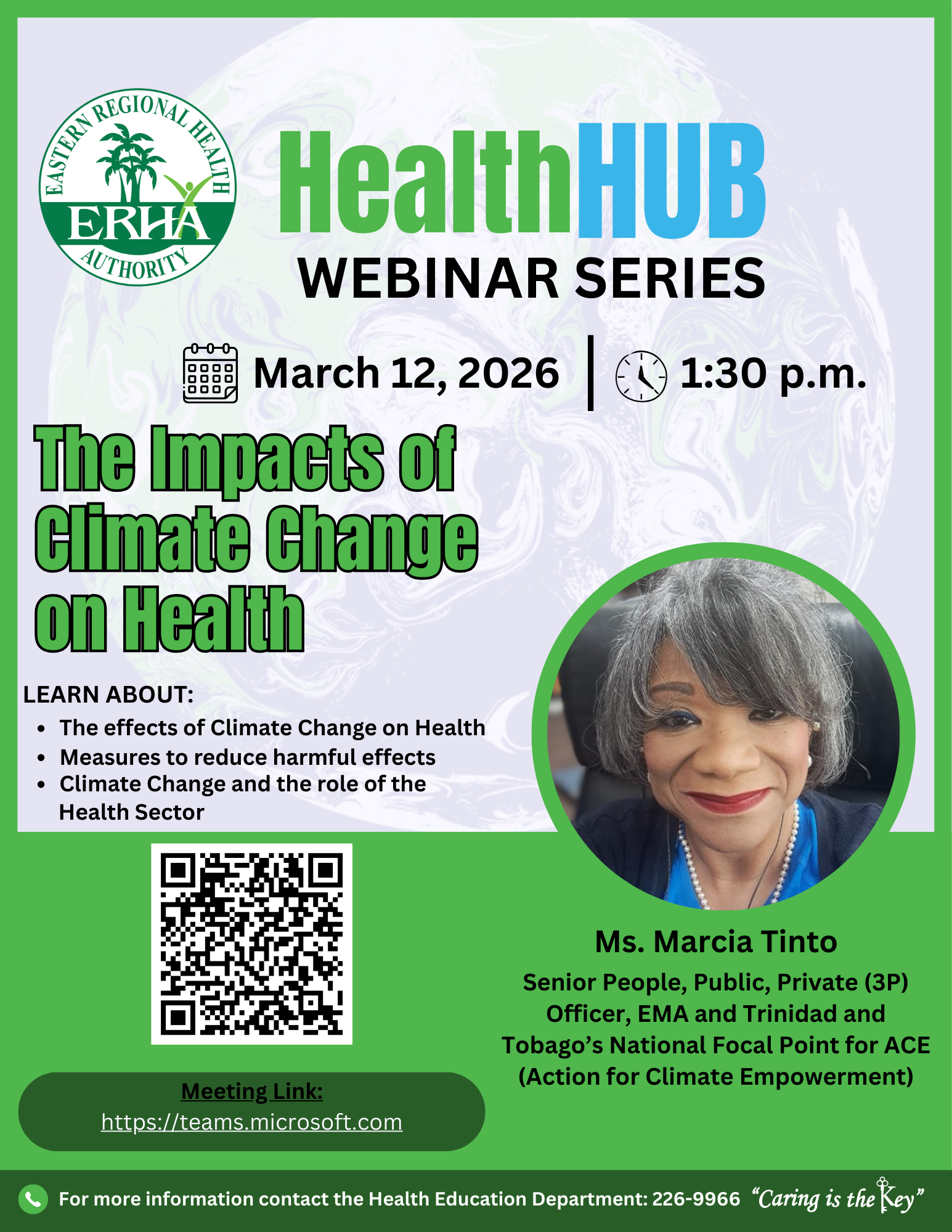 Join Ms. Marcia Tinto, Senior People, Public, Private (3P) Officer- EMA and the Trinidad and Tobago’s National Focal Point for ACE as she discuss the Impact of Climate Change on Health