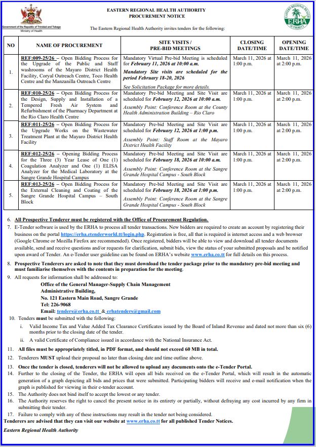 By chrystalbuteFebruary 2, 2026News and Events, Tender Notices The Eastern Regional Health Authority invites Tenders for the following: Visit our Tender Notices page for details.