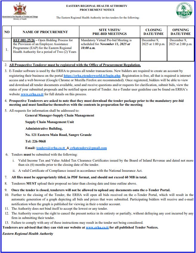 By chrystalbuteOctober 31, 2025News and Events, Tender Notices The Eastern Regional Health Authority invites Tenders for the following: Visit our Tender Notices page for details.