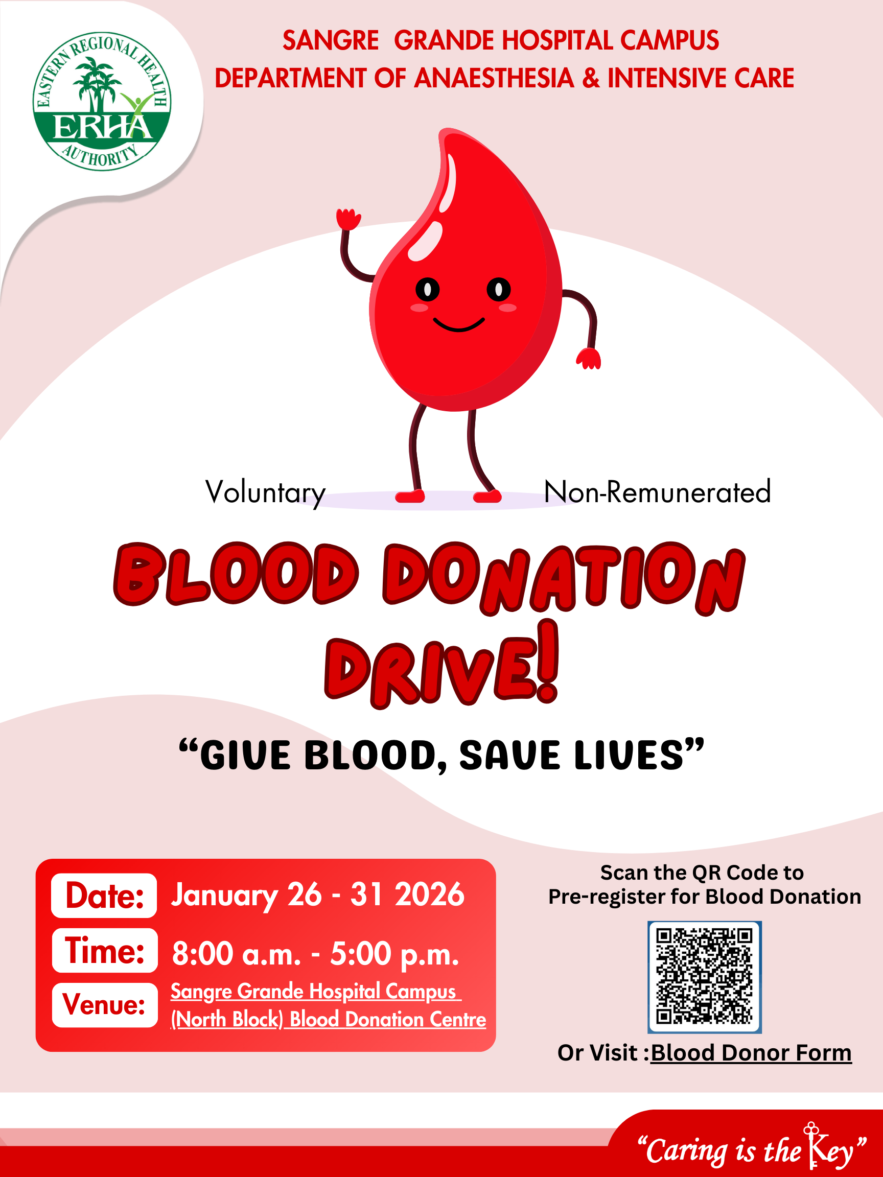 Sangre Grande Hospital Campus, Department of Anaesthesia & Intensive Care, invites you to be part of our Voluntary, Non-Remunerated Blood Donation Drive.