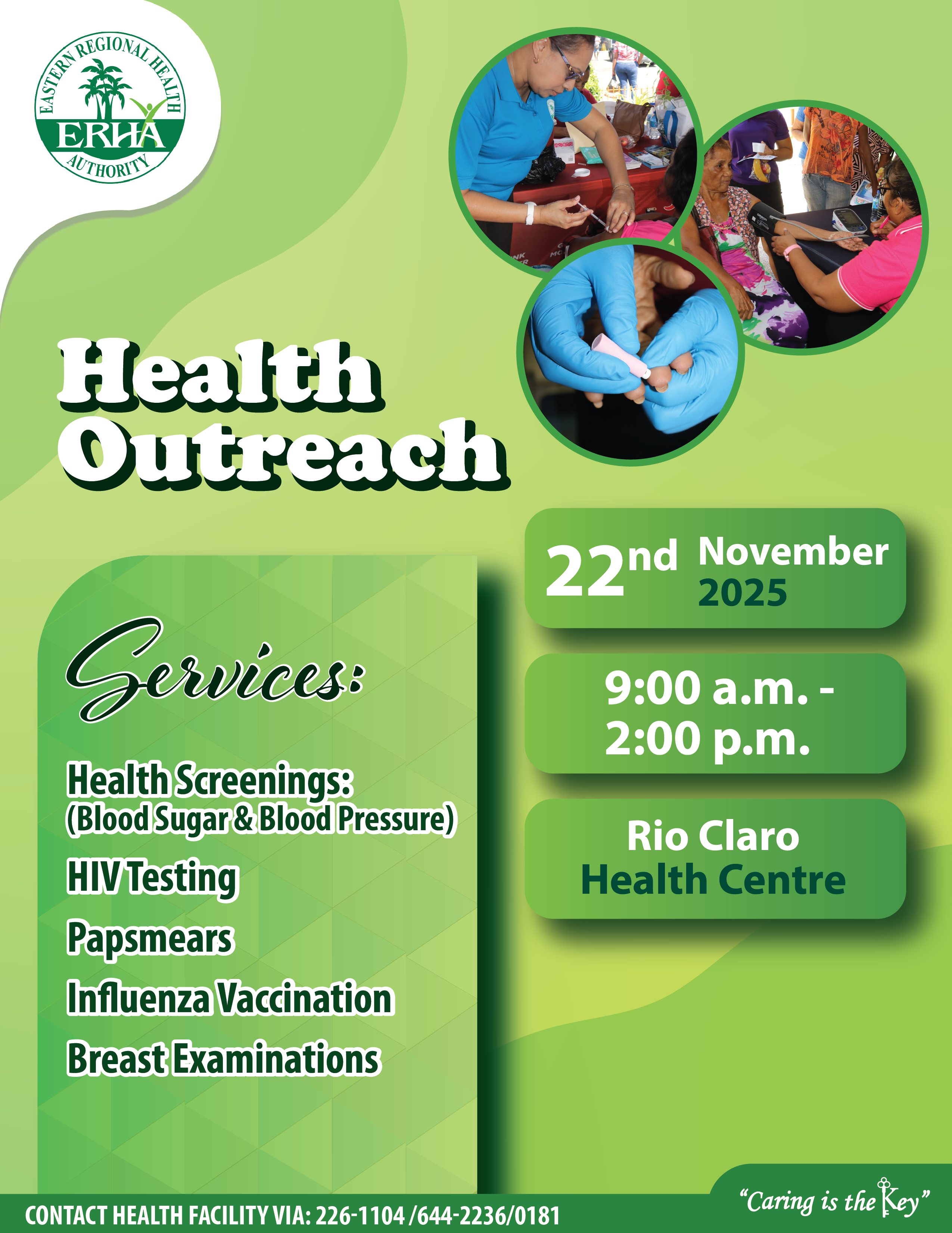 The Eastern Regional Health Authority invites you to our Health Outreach on November 22, 2025 at the Rio Claro Health Centre.