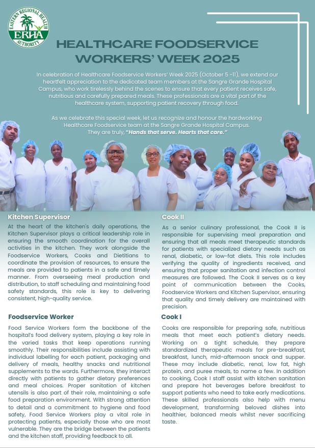 In celebration of Healthcare Foodservice Workers’ Week 2025 the Eastern Regional Health Authority extend heartfelt appreciation to the Healthcare Food Service team.