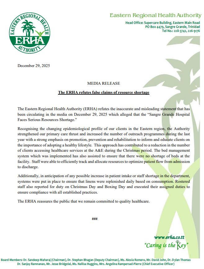 The Eastern Regional Health Authority (ERHA) refutes the inaccurate and misleading statement that has been circulating in the media on December 29, 2025 which alleged that the “Sangre Grande Hospital Faces Serious Resources Shortage.”