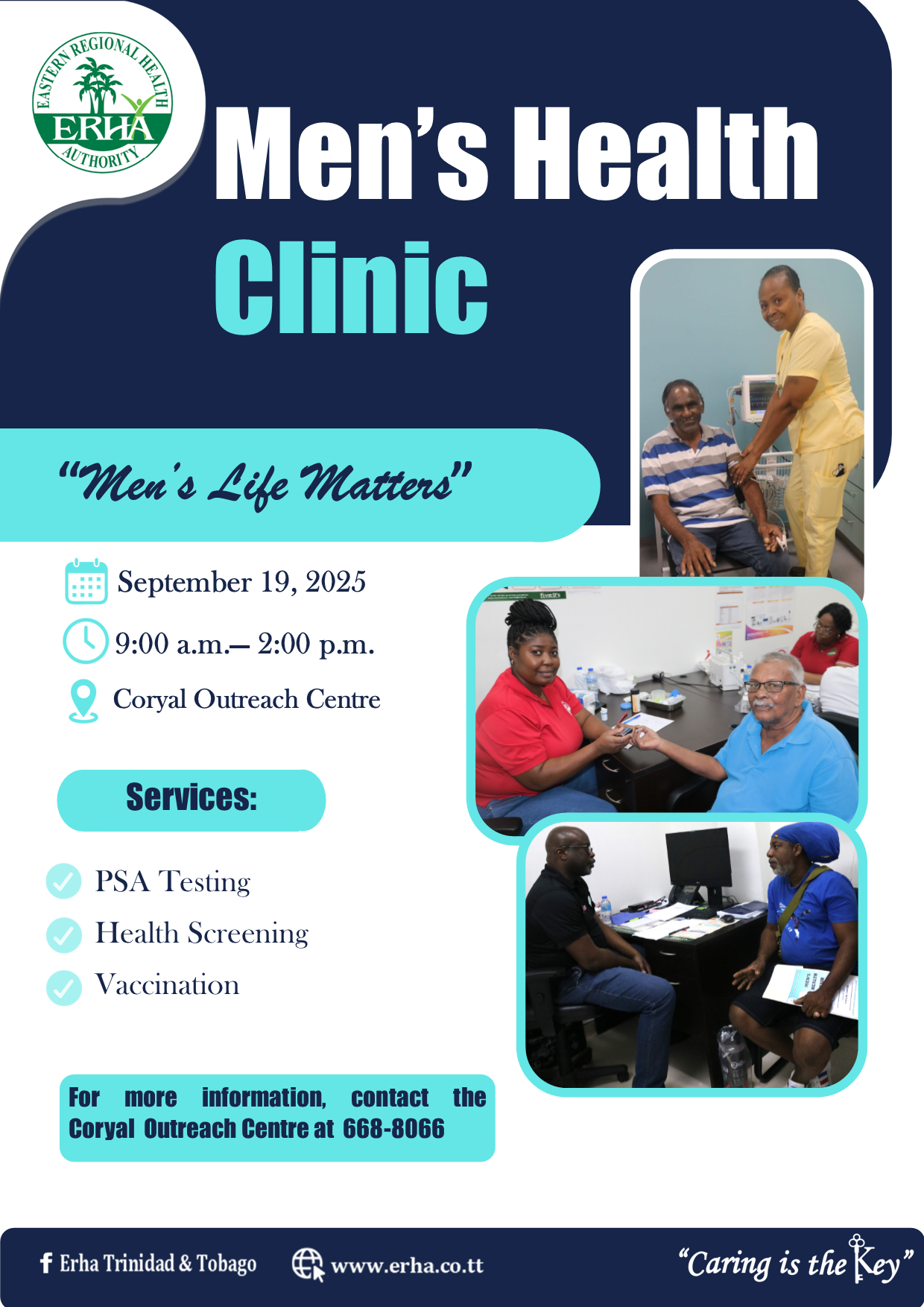 The Eastern Regional Health Authority invite you to our Men’s Health Clinic on September 19, 2025 from 9:00 a.m. at the Coryal Outreach Centre.