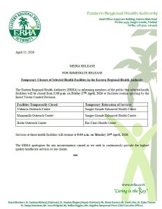 The Eastern Regional Health Authority (ERHA) is informing members of the public that the following health facilities will be closed from 1:00 p.m. on Friday 17th April, 2026 to facilitate routine spraying by the Insect Vector Control Division: