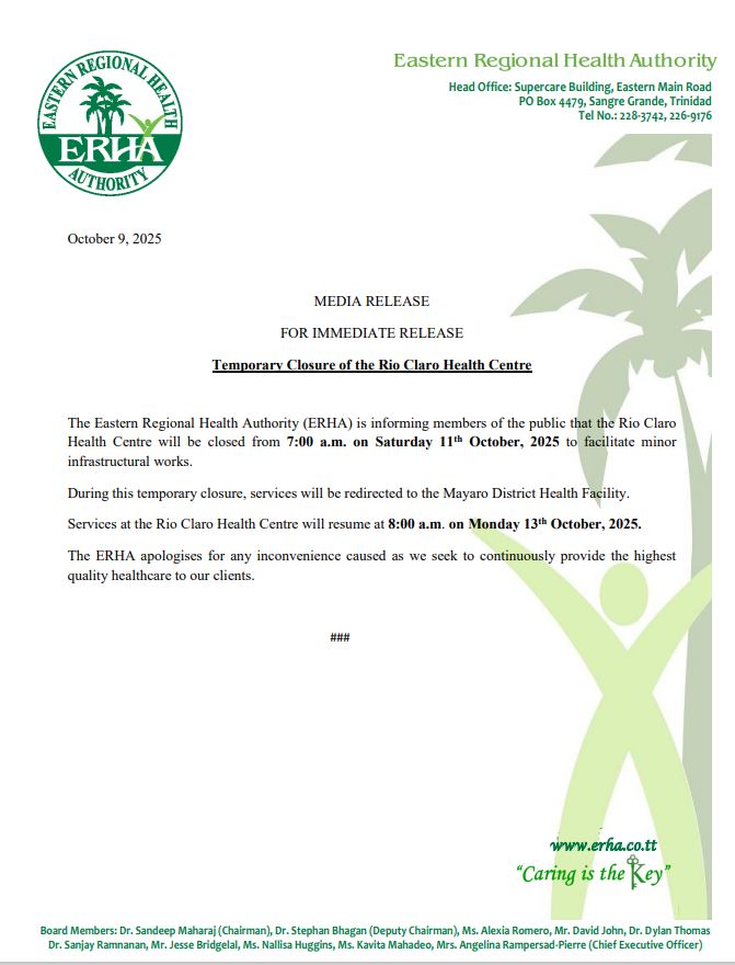 The Eastern Regional Health Authority (ERHA) is informing members of the public that the Rio Claro Health Centre will be closed from 7:00 a.m. on Saturday 11th October, 2025 to facilitate minor infrastructural works.