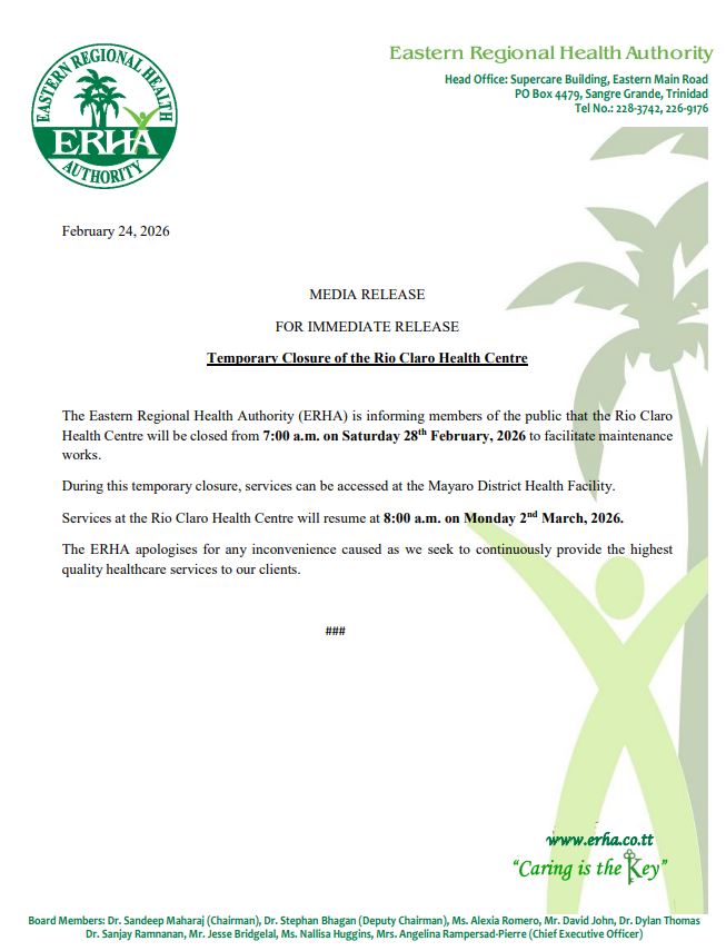 The Eastern Regional Health Authority (ERHA) is informing members of the public that the Rio Claro Health Centre will be closed from 7:00 a.m. on Saturday 28th February, 2026 to facilitate maintenance works.