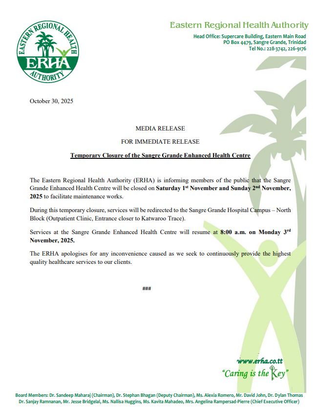 The Eastern Regional Health Authority (ERHA) is informing members of the public that the Sangre Grande Enhanced Health Centre will be closed on Saturday 1st November and Sunday 2nd November, 2025 to facilitate maintenance works.