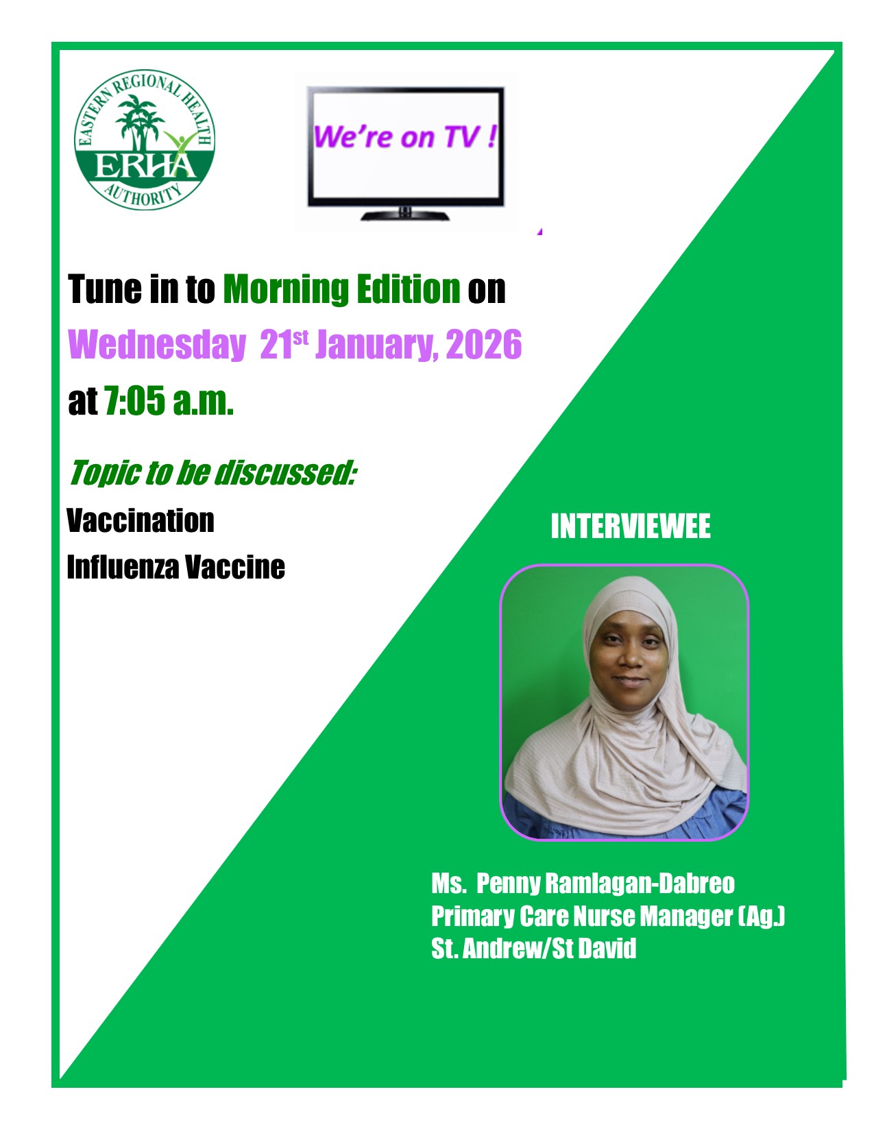 Ms. Penny Ramlagan-Dabreo, Primary Care Nurse Manager (Ag.) St. Andrew/St. David will appear on the Morning Edition Programme tomorrow at 7:05 a.m. She will be accompanied by a Ministry of Health official and they will be discussing the important topic of vaccination.