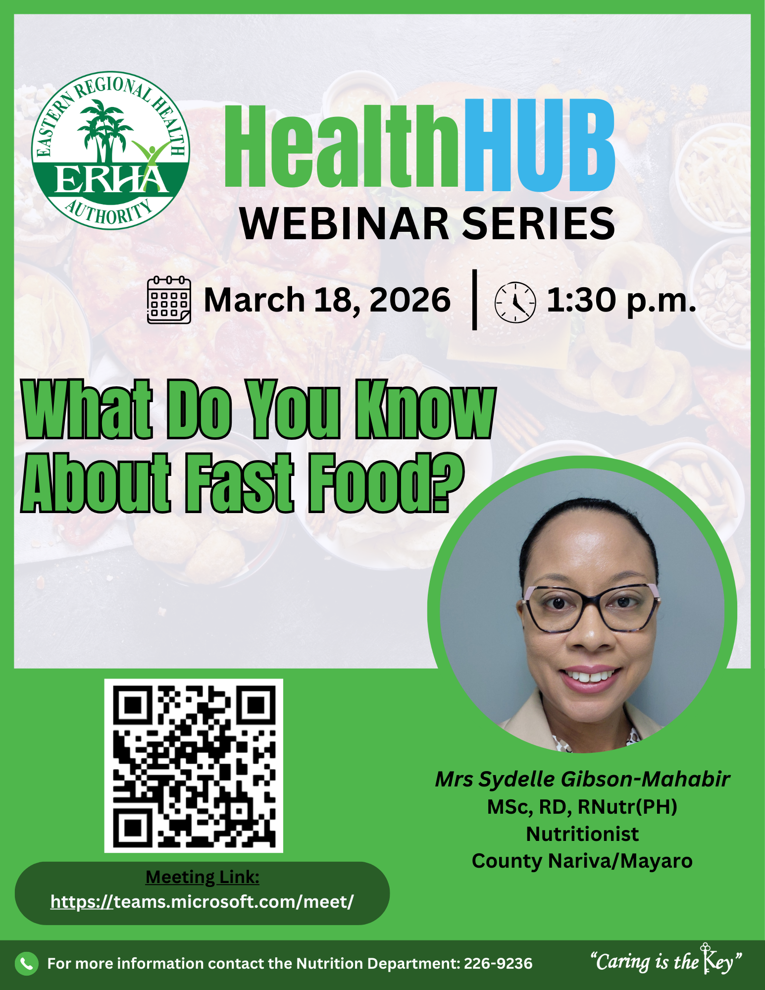 Join Mrs. Sydelle Gibson-Mahabir, MSc, RD, RNutr(PH), Nutritionist for County Nariva/Mayaro, as she explores the effects of fast food on your health and shares tips for healthier eating habits!